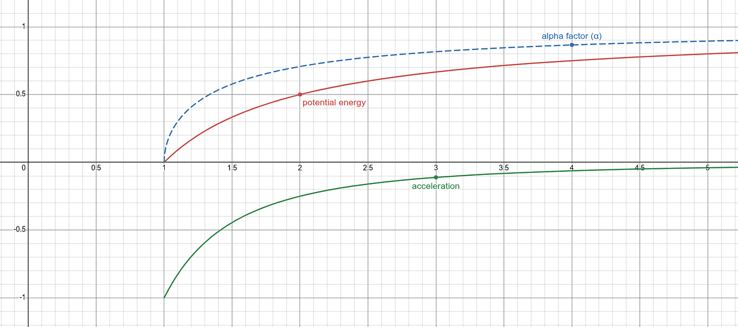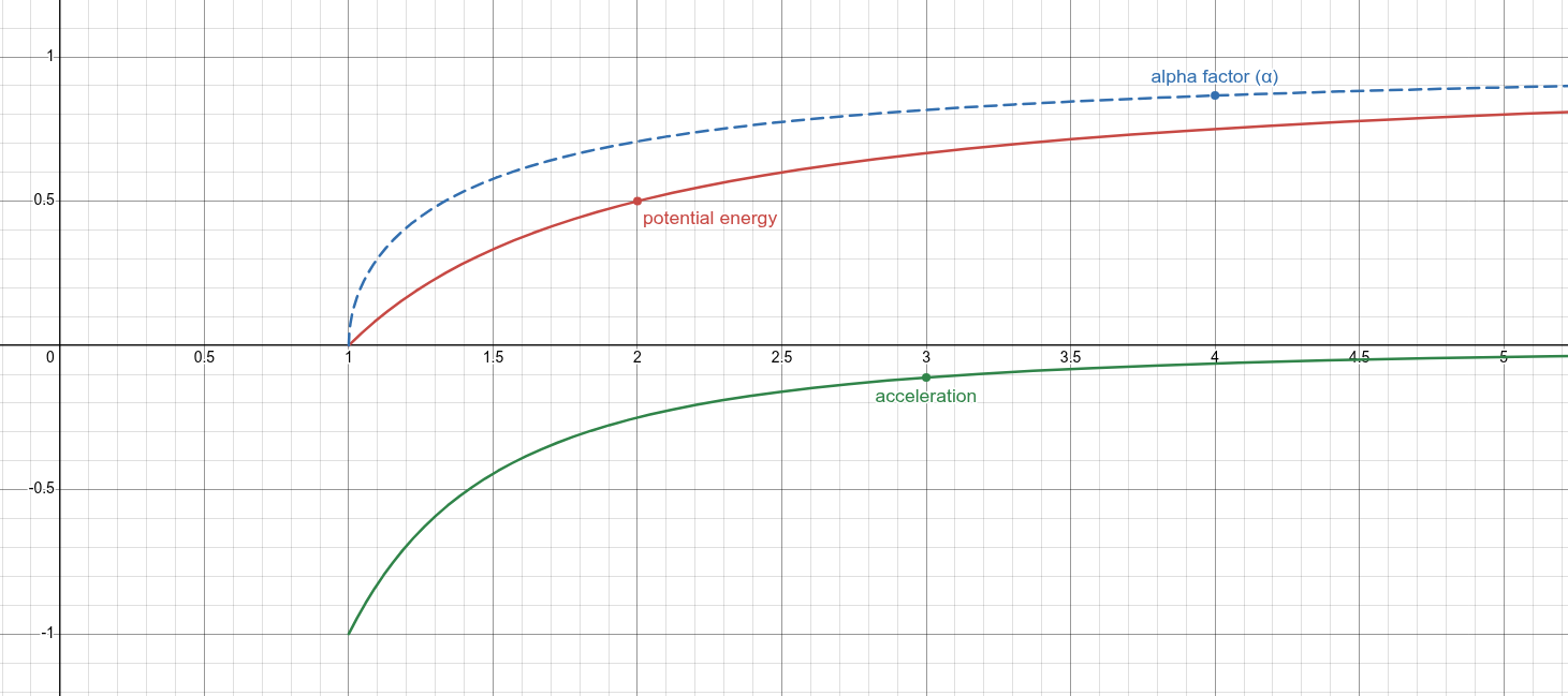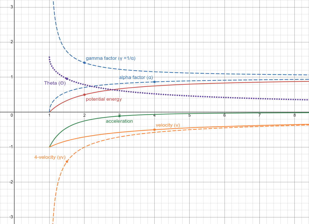 The basic premise is that gravity is derived from the field of potential energy, from which all other energies withdraw. The field has a top, herein at one. It has a bottom at zero. You can’t take more than there is, and you can’t take less than nothing. The field deforms as the inverse of the distance from the center, starting at 1 unit from the center. Why there? Anything closer is inside. Changes to the field propagate at a fixed rate: the speed of light. Acceleration is negative to show attraction towards. The speed of light = 1.