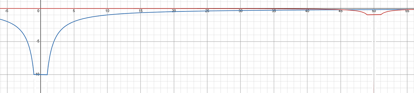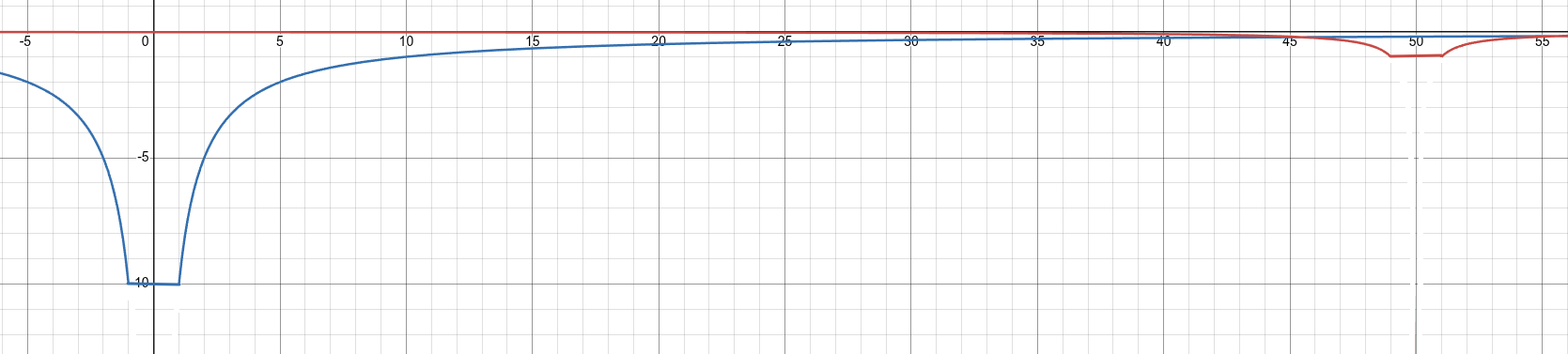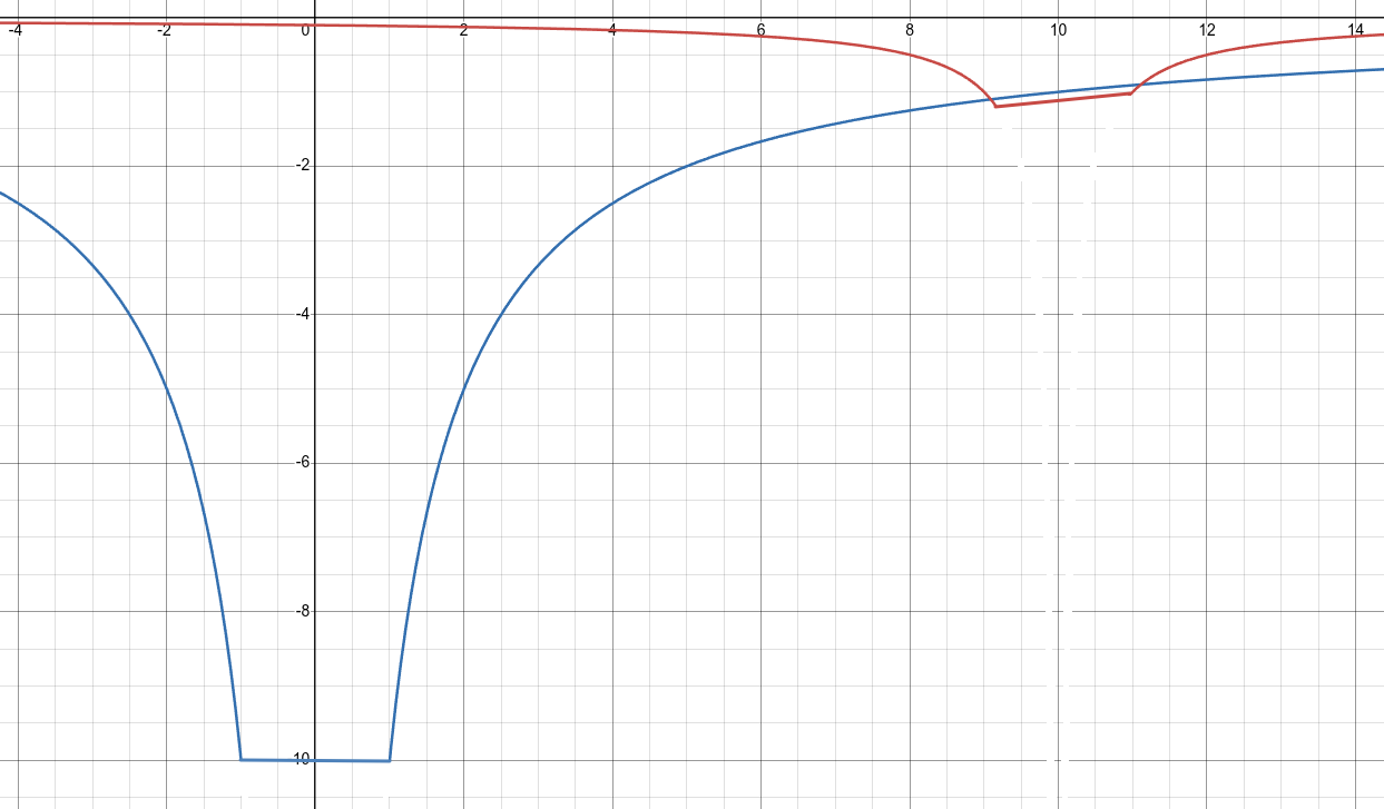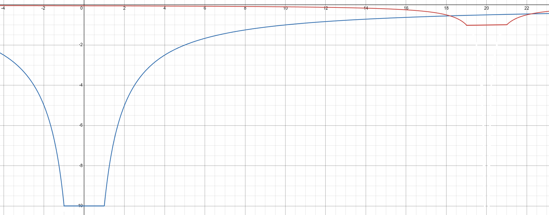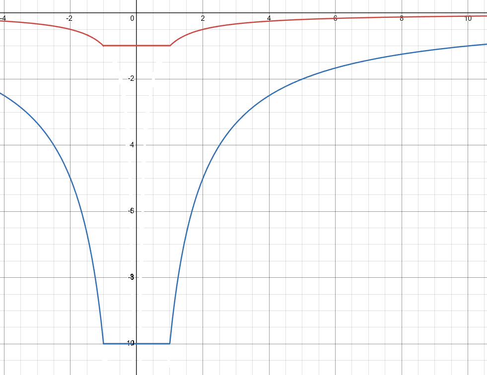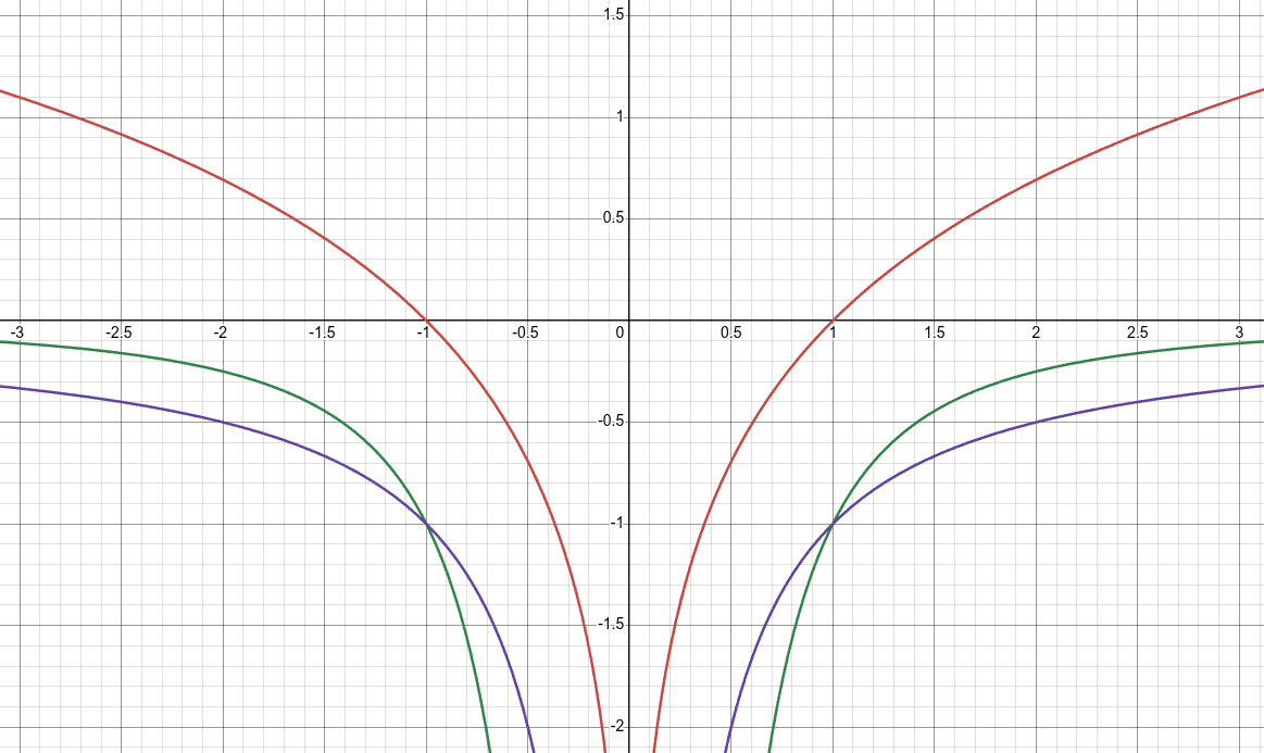 Red is position -ln|x|, green is velocity -|1/x|, purple is acceleration -|1/x2|.