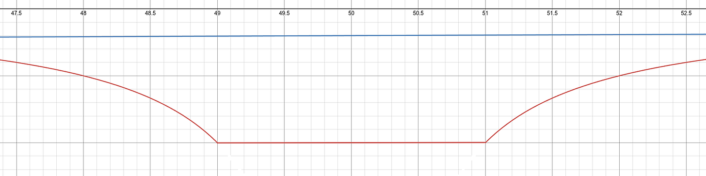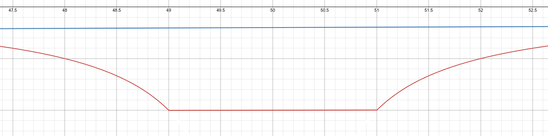 Since particles are not point-like, we cannot use the standard 1/x2 force laws. We instead use the calculated gradients. Fortunately, all particles always have the same fixed radius and the field is conservative. That lets us compute a gradient along a curve segment as the difference of the ends of the segment, ignoring everything in between. This is a simplification, as the particle must be physically capable of crossing every subsegment without running out of energy in that direction. A key feature is the radius of the particle r, so the gradient moving to the left from points a to b is calculated from a+r to b-r.