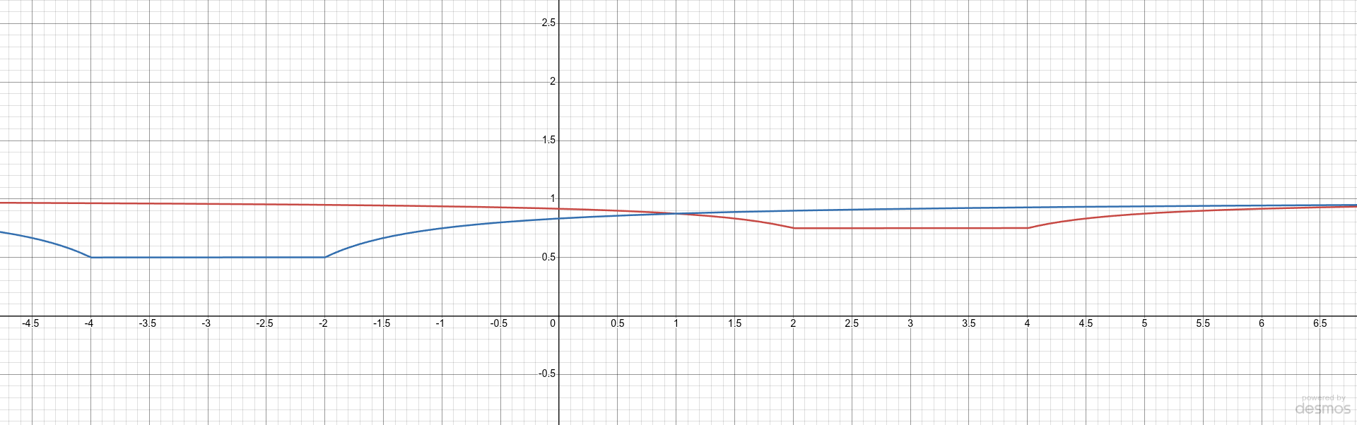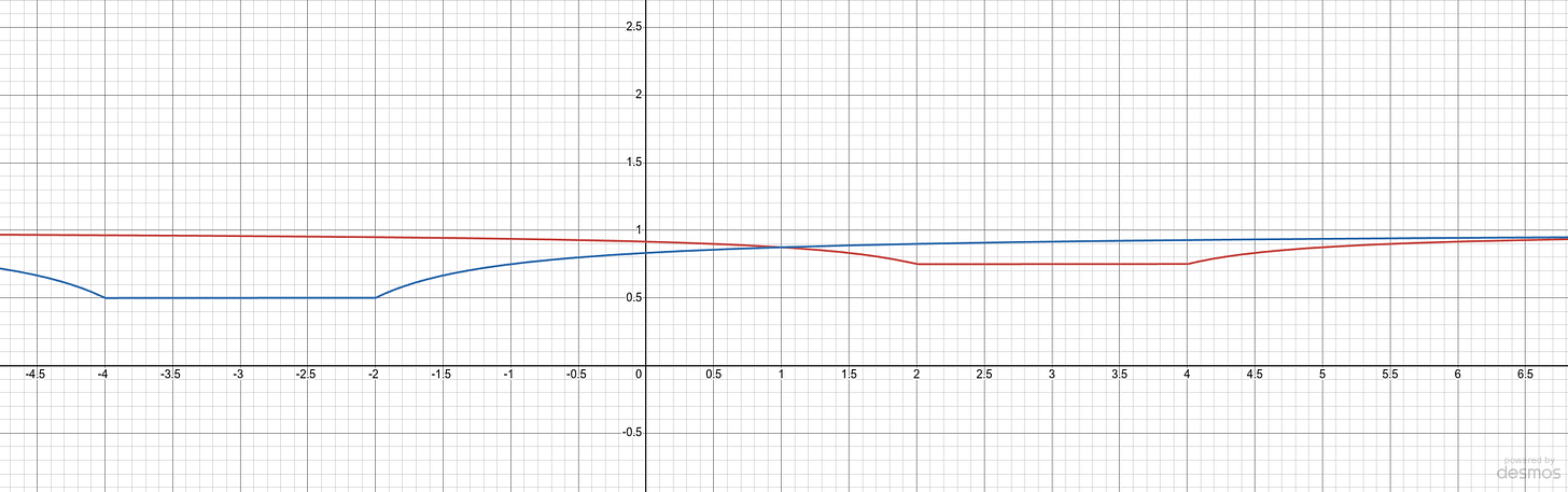 Here we have two test particles in the potential energy field, held motionless by the magic of wanting a simple example. The blue one on the left has a mass of 0.5 (the Planck mass = 1 in this model). The red one on the right has a mass of 0.25. They are close to each other, with one centered at -3, the other at +3. Each is, of course, of radius one, as are all particles regardless of mass. Once we release the less massive particle on the right, what happens to it?