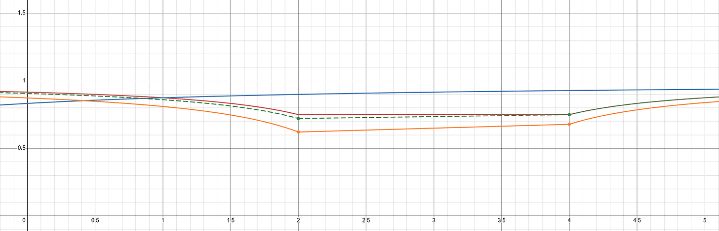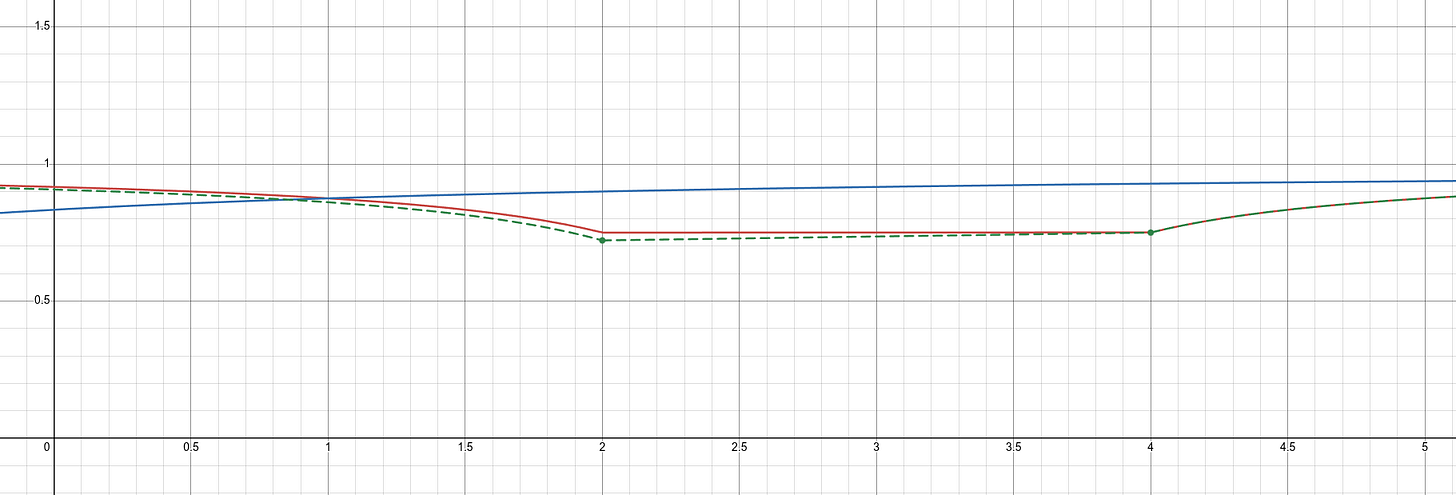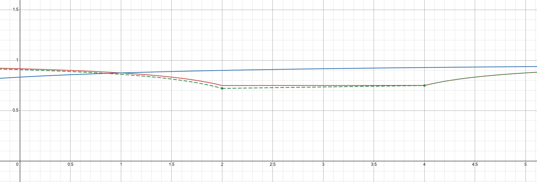 The particle gains an internal energy gradient equal to the gradient of the ambient field inside its boundaries. This internal gradient grants it a velocity in the direction of the lower level of the field, towards the left. The internal gradient is now a permanent part of the particle’s energy profile, shown as dashed green. Well, permanent until the next moment in time, that is. Then the particle will once again gain an internal gradient equal to the gradient of the background field. This works almost like compound interest. As long as time keeps moving forward and the particle keeps moving, the internal gradient (the particle’s kinetic energy) will continue to change. This grants a steadily increasing velocity leftwards, toward the other particle. This is exactly as we expect and Newton so ably described.